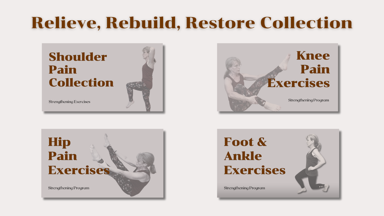 There are four different exercise programs in the collection that focus on specific body areas where my clients frequently experience pain or chronic problems... Knees, Shoulders, Hips, & Feet/Ankles.